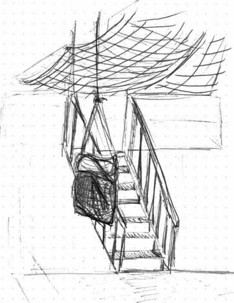 À l’occasion de ma dernière visite et en attendant mon Client, j’ai réalisé une esquisse rapide de l’intérieur de la « taule » avec ses emblématiques sacs attachés par des cordes qui montent dans les étages par un système de poulie et ses filets qui voilent le plafond pour empêcher les chutes d’objets.
